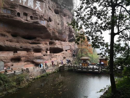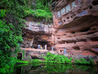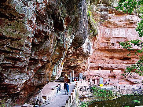 真仙洞府:過天門巖,下石階即達。這里危崖三彎折,相連如城垣。巖下通道沿砌石欄桿,欄外為碧蓮池,共構(gòu)一“叵”字形;崖間洞窟累累,依次有八仙洞、觀音洞、真仙洞(羅漢洞)、雨君洞、文昌洞、白馬洞、珠簾洞,就洞建宮宇,祀道教各路神仙,統(tǒng)稱真仙洞府。崖壁、摩崖題字石刻,如“天開神秀”、“齊云勝景”等多達近百處。