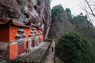 紫霄崖:于齊云巖西南。從浮云嶺西行,經(jīng)百丈泉、馴鹿洞、紫玉屏即達。古跡有:玉虛宮、治世仁威宮、天乙真慶宮、唐寅手撰碑銘、風虎關(guān)、云龍關(guān)遺址及摩崖石刻30余處。