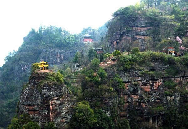 洞天福地:位于望仙亭東南,又稱桃源洞天。后倚丹崖?lián)泶氐恼拐a峰,前臨涓涓流淌的桃花澗。明代建有洞天福地祠、斗姆閣、寥陽殿、青羊?qū)m,三元宮、桃源洞天亭等建筑,今圮;僅存八卦池、邋遢仙墓、仙人床及宮、閣、殿祠遺址。