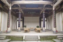 前廳是整幢房子中最精華的部分,大門后面聳立著一幅威儀的中門,在中門“福”字的上方,鑲有一幅木雕“百子鬧元宵”圖,圖上雕刻著100個小男孩過元宵鬧花燈時的情景,這正是古代“多子多!眰鹘y(tǒng)觀念的生動寫照,“百子鬧元宵”圖兩邊的“商”字斗拱上則分別雕有四出《三國演義》的戲文,斗拱的上方雕有“南、北”財神,“南、北”財神的上方是閣樓護(hù)板,在此,汪定貴設(shè)計了“漁、樵、耕、讀”四根木雕立柱,分別代表了古代的四種職業(yè)。