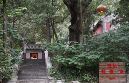 出秘魔崖,沿證果寺門前小盤道下行至南面水井,此處樹木成林,茂密非常,且均高大參天。日出東坡,光照林梢之時(shí),愈發(fā)覺得明暗濃淡別有意趣。唐詩所詠:“清晨入古寺,初日照高林”似不啻此處之景。