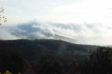 仲夏清晨,雨后天氣濕潤時(shí),?梢娙缢厝缇毜脑旗F飄浮于三山之腰,似斷還連的畫中之境。注目靜觀,或自峰后繞于嶺前,或從石隙游出升騰;有時(shí)凝固不甚流動(dòng),有時(shí)行走又很疾速。翠微山、虎頭峰間凝然不動(dòng)者居多,盧師山青石黛樹中則流走如飛者眾。概山勢(shì)高低不同所致。