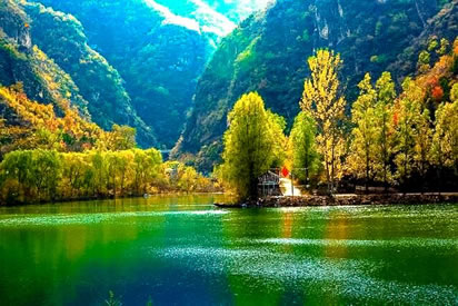 北京延慶烏龍峽谷景區(qū)——原名黑龍?zhí)。位于黑河的下游,屬距?.4億年前的中生代火山熔巖區(qū),全長2公里,是典型的山間河流深切河谷地貌景觀,峽谷兩側(cè)絕壁陡直、怪石林立,水聲轟鳴,浪花飛濺,以青山幽谷、碧水深潭遠(yuǎn)近聞名。這里,懸崖陡壁,潭澗相連,依次為四潭、三潭、二潭、頭潭;其中,頭潭較闊,四潭最深。每年豐水時節(jié),峽谷內(nèi)奔涌的河水從幾十米高的懸崖上飛瀉而下,激蕩于山澗巨石之間,但見浪濤擊石,銀花飛濺,雷鳴般的濤聲如群獅怒吼,煞是壯觀。