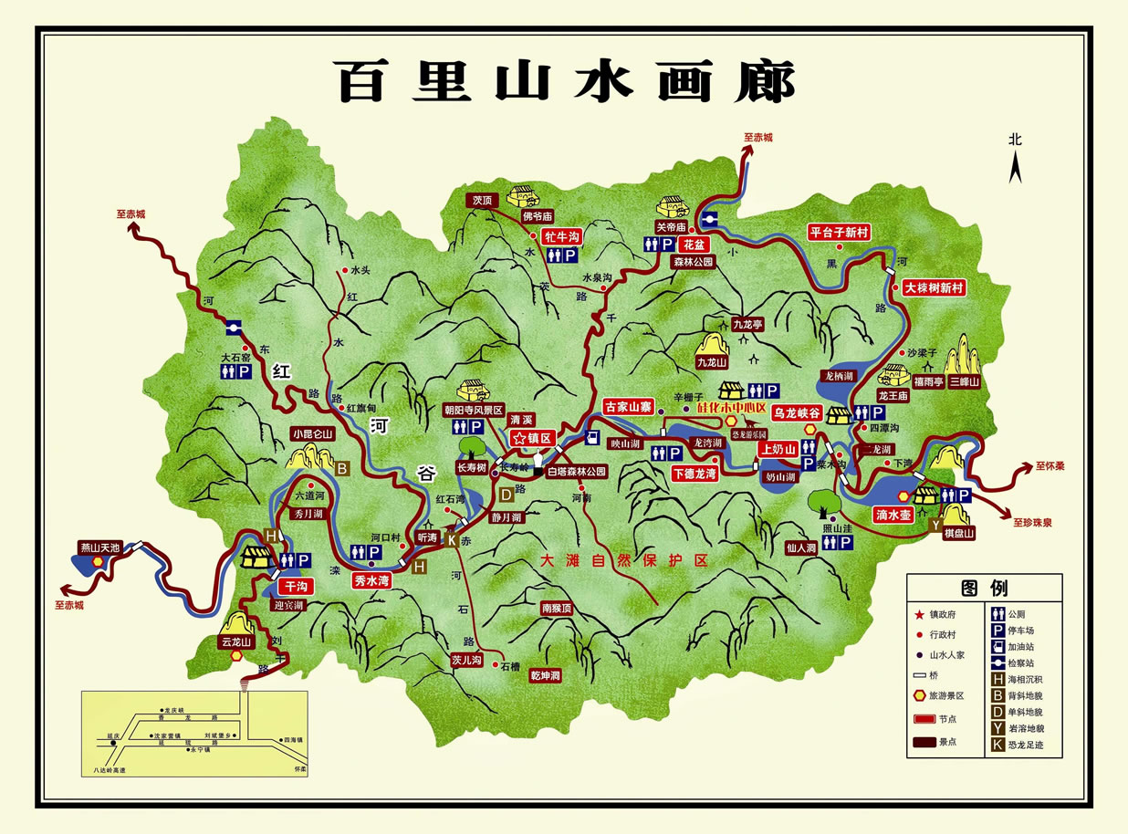 北京延慶百里山水畫廊景區(qū)位于延慶區(qū)東北部千家店鎮(zhèn)中國延慶世界地質(zhì)公園千家店園區(qū)內(nèi),屬延慶生態(tài)涵養(yǎng)區(qū)的核心區(qū),總面積371平方公里,距縣城40公里,距北京市區(qū)110公里。東與懷柔區(qū)毗鄰,北與河北省赤城縣接壤,西南、東南分別于香營、劉斌堡、珍珠泉三個鄉(xiāng)相連。灤赤、花千、花沙公路穿鎮(zhèn)而過自成環(huán)線,交通便利。