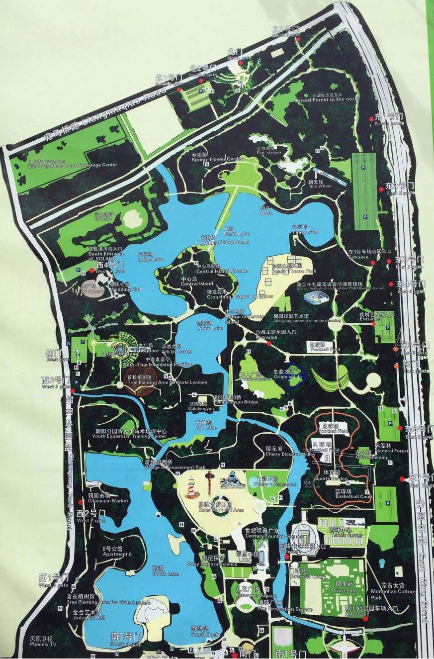北京朝陽(yáng)公園是一處以園林綠化為主的綜合性、多功能的大型文化休憩、娛樂(lè)公園。是北京市四環(huán)以內(nèi)最大的城市公園,原稱水碓子公園,始建于1984年,1992年更名為北京朝陽(yáng)公園。南北長(zhǎng)約2.8公里,東西寬約1.5公里,規(guī)劃總面積為288.7公頃,其中水面面積68.2公頃,綠地占有率87%。朝陽(yáng)公園建成的景點(diǎn)有中央首長(zhǎng)植樹(shù)林、將軍林、世界語(yǔ)林等二十多個(gè)景點(diǎn)。