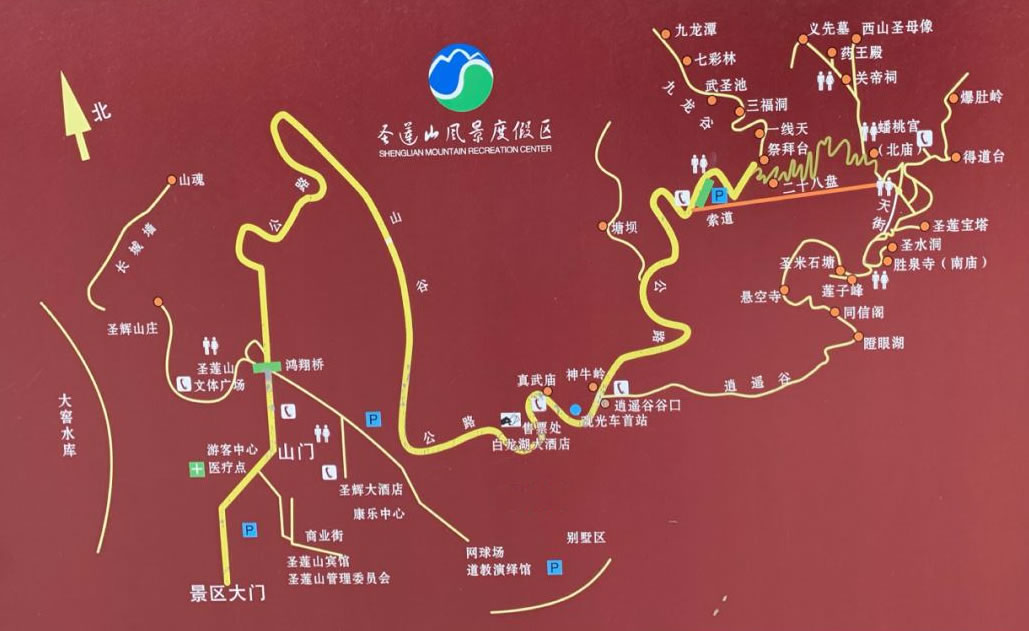 圣蓮山景區(qū)海拔1030米,屬暖溫帶半濕潤,半干旱大陸性季風(fēng)氣候,四季特征明顯,夏季涼爽怡人,冬季霧鎖迎客松,平均氣溫10℃。7月氣溫最高,平均氣溫24℃。植被垂直分布,分別為溫帶闊葉林、鵝耳櫪萌生叢和荊條灌叢,以九龍谷生態(tài)溝尤為顯著。野生動物有哺乳類、鳥類、爬行類和兩棲類,其中,斑羚、豺、赤狐、紅腳隼、禿鷲、蒼鷹等均為國家級保護(hù)動物。為了便于游覽獨(dú)特的地質(zhì)遺跡,景區(qū)建成包括綜合服務(wù)區(qū)、典型地質(zhì)遺跡觀賞區(qū)、“圣米”觀賞區(qū)、巖洞洞穴游覽區(qū)、地表巖溶地貌觀賞區(qū)以及人文景觀區(qū)6個(gè)游覽觀賞區(qū)的市級地質(zhì)公園。主要景觀有山門、神牛嶺、佛椅山、斑馬石、三碰水、檀香茶舍、祭拜臺、九龍谷、翠屏峰、二十八盤道、鷂子翻身、蟠桃宮、九蓮洞、三清殿、古真堂、打坐臺、八仙洞、天街、蔡義先墓、李娘子宅、長春洞、關(guān)帝祠、西山圣母、通天洞、夏日觀雪、長星觀、萬仙洞、圣水洞、圣米石塘、望鄉(xiāng)亭、南天門、百里臥佛、圣蓮寶塔、古碾房、杏林塔院、逍遙谷、天生橋、閻王爺鼻子、晾馬臺、古松、迎客松等。