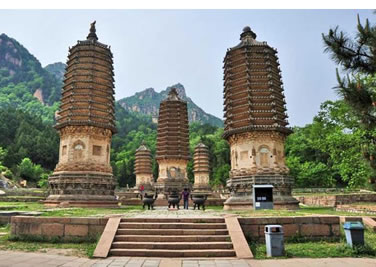 其他11座塔均為喇嘛塔。有石及磚石兩種結(jié)構(gòu)形式,形制較簡單,尺度亦較小,最高的自塔頂圓盤至地面高5.71米,最低的殘存部分僅高1米有余。備塔的形制、基座部分均為石砌須彌座式,平面有四邊和六邊形兩種形式。塔身部分均為覆缽形,有磚砌和石砌兩種。石砌的塔身均于正面設(shè)有眼光門。塔身與基座之間施以石刻蓮瓣及金剛?cè)?shù)層。塔頂部分,塔脖子均作石刻束腰形,其上為相輪組成的十三天及圓盤等石刻裝飾。 |