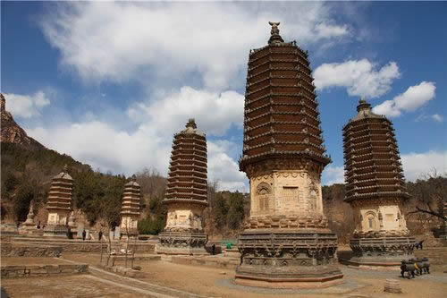 銀山塔林位于銀山南麓,現(xiàn)存17座墓塔,大小高矮不等,高者20余米,直徑達(dá)7米左右,矮者只有兩三米高。從塔的形制上看,大體上可分為兩大類:一為密檐式塔,二是覆缽式塔。這里保存的幾座大型墓塔全部是密檐式結(jié)構(gòu),是北京地區(qū)保存最好、最為集中的密檐式塔群。有六角形和八角形兩種,都是仿木結(jié)構(gòu)的密檐式磚塔。塔身自下而上逐層遞減,塔的高度不等,最高的佛覺禪師塔高22.8米。造型最為精美的是懿行大師塔,是典型的金代作品。塔高18米,平面為八角形,塔基由須彌座和斗拱勾欄平座組成,須彌座雕有獅頭寶瓶等紋飾,整個塔基除斗拱外,滿布花紋,雕刻繁縟,頗具匠心。仰蓮之上為塔身,塔身八隅旋圓柱,頂端砌以闌額普相枋,檐下每間補間旋施斗拱一朵,單抄四輔作。塔身四面辟假門,其余四面辟方形假窗。塔共拔檐13層,每層用疊澀手法向外砌出五層,代替檐椽,逐層收減,呈現(xiàn)出豐滿有力的卷殺。