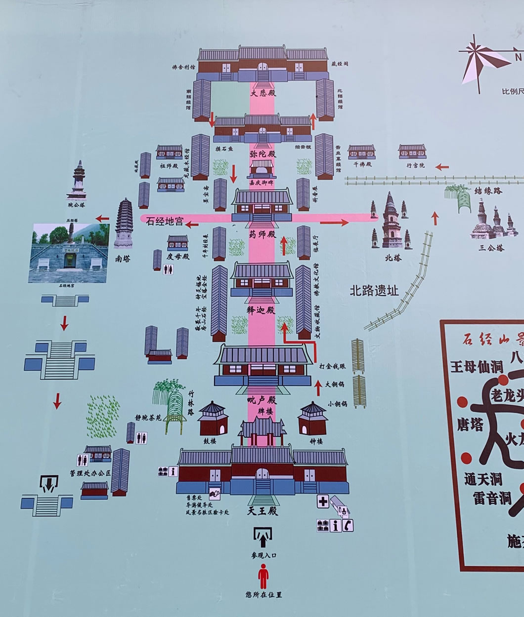 石經(jīng)山海拔450公尺,山腰有9個(gè)藏經(jīng)洞,其中雷音洞為開放式,洞內(nèi)寬廣如殿,四壁鑲嵌經(jīng)板大都是靜琬早期所刻。洞中有四根石柱,石柱上雕佛像1056尊,故稱千佛柱,九洞共藏經(jīng)4196塊。石經(jīng)山現(xiàn)存唐塔兩座,還有石鑿古井、隋唐碑刻等大批歷史遺存。為了便于游客上山觀光攬勝,云居寺于1999年10月24日開通了全長830米的石經(jīng)山索道。