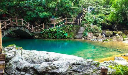 雙龍戲珠是峽谷溪流中一塊天然形成的石頭,仿佛巨大的珠子將潺潺流水分成兩道,流水猶如兩條靈動的小白龍圍繞著龍珠嬉戲游玩,故名雙龍戲珠。