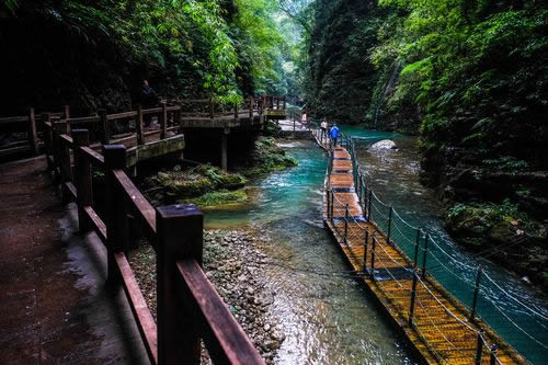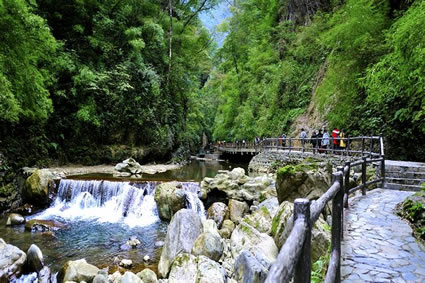 黑猴峽是黑山谷第二個峽谷,峽谷全長420米,最窄處僅2米,兩岸險峰重疊,犬牙交錯,岸壁傾斜超過90度,長年累月難見天日,即使在烈日高照、炎熱難耐的盛夏,這里也是寒氣襲人。因有國家一級保護動物黑葉猴經(jīng)常攀跳、嬉戲于此而得名。