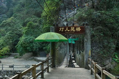 石皇傘位于河谷中央,兩塊30噸重的巨石緊緊地疊在一起像一把巨傘。為崩塌遺跡景觀,巖壁崩塌至谷底后受到谷底山洪沖蝕作用,因上下巖層強度差異,蹦落體下部遭受洪水沖蝕的強度大,小塊松散物被帶走,巖石變細;崩落體上部巖石由于受河水沖蝕作用弱而保持原樣,其形狀很像一把撐開的大傘,故名石皇傘。