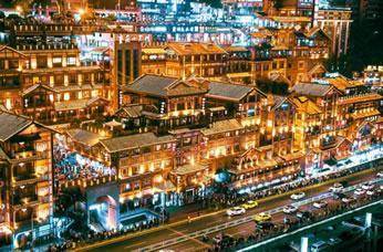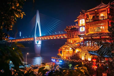吊腳樓作為西南地區(qū)獨有的傳統(tǒng)民居建筑,最早可追溯到東漢以前。由于重慶山多,土地緊張,祖先依山就勢,因地制宜,利用木條、竹方,懸虛構(gòu)屋,陡壁懸挑,依山建造出一棟棟樓房。依山、靠崖、臨江是重慶吊腳樓的獨到之處,洪崖洞吊腳樓建筑群復原了巴渝古都風貌,把古重慶最具特色的吊腳樓、古牌坊、木垂花、懸挑梁、雕刻樓廊、半山街市和青石板路等山地民居集中展現(xiàn)出來,在懸崖峭壁上建成高13層的吊腳樓群,因此被建筑業(yè)界稱為“中華懸崖城”,被中外媒體譽為“天空之城”。