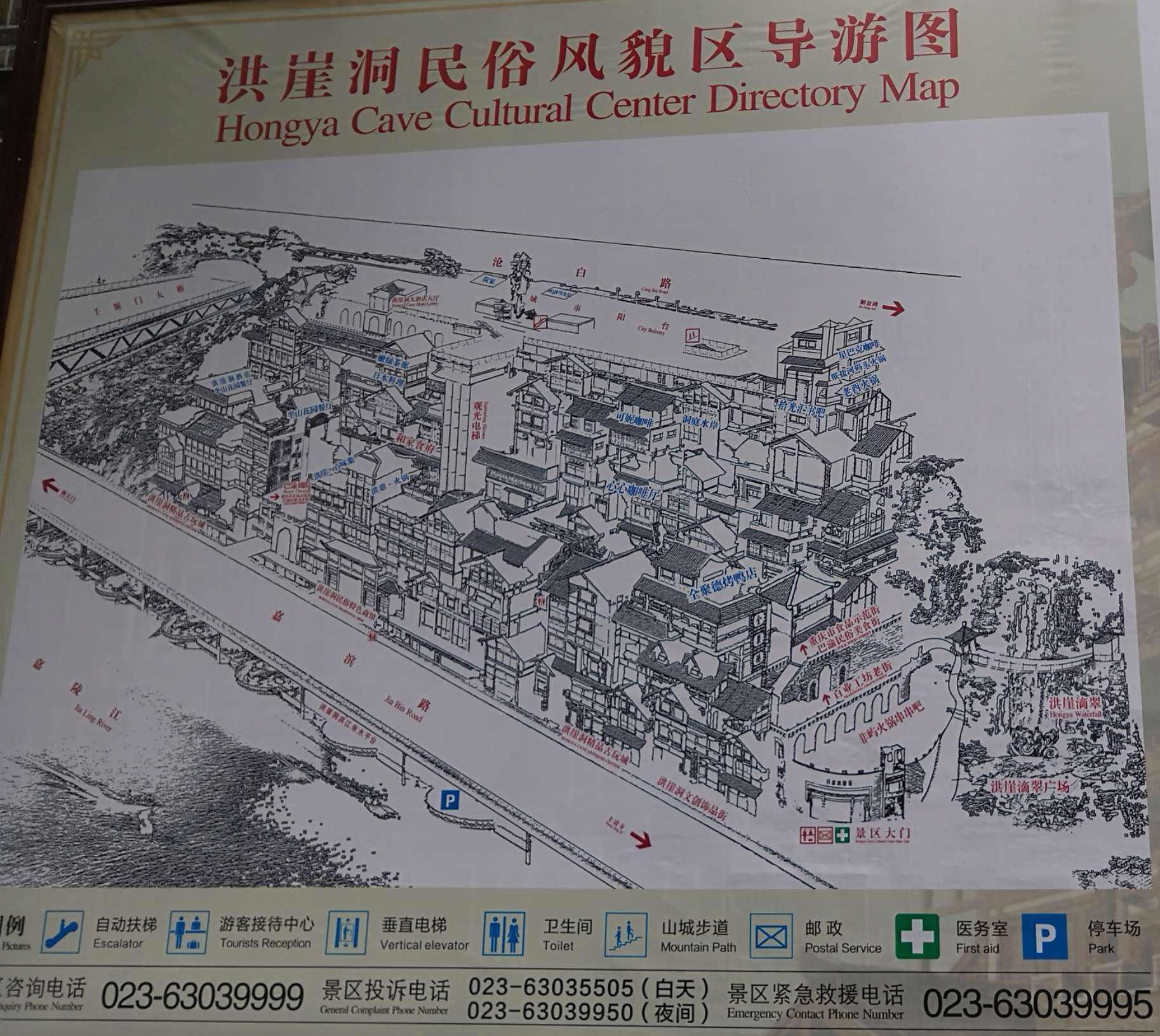 洪崖洞民俗風貌區(qū)長約50米,總占地面積3.15萬平方米,分為紙鹽河精品古玩街、天成巷百業(yè)工坊老街、洪崖洞巴渝民俗美食街、洪崖洞異域美食街。有特色餐飲、休閑娛樂、巴渝民間工藝品、特色旅游商品及精品古玩等店鋪。洪崖洞一共有11層,夜晚燈光從晚上6點開燈,10點熄燈?赏跄_群樓觀洪崖滴翠,逛山城老街賞巴渝文化,燙山城火鍋看兩江匯流,品天下美食。形成了“一態(tài)、三絕、四街、八景”的經(jīng)營形態(tài),體現(xiàn)了巴渝文化休閑業(yè)態(tài)!耙粦B(tài)”指的是文化休閑業(yè)態(tài)!叭^”指的是吊腳樓、集鎮(zhèn)老街、巴文化;“四街”指洪崖洞的四條街:動感酒吧街、巴渝風情街、盛宴街美食街、城市陽臺異域風情街。四條大街分別融匯了時尚元素,主題迥異特色鮮明。成為重慶娛樂生活、夜生活的標向!鞍司啊敝傅氖呛檠碌未洹山瓍R流、吊腳樓群、洪崖群雕、城市陽臺、巴文化柱、濱江好吃街、嘉陵夕照。