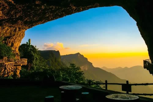 古佛洞位于山頂部位藥池壩東北側,海拔2100米。進洞口高約5米,寬3米,經(jīng)洞左狹窄通道進入有1公頃大的“大廳”,內有古佛、石棺材、米市、戲樓等景點。左行400余米,洞穴逐漸收縮,形成人工隧道似的大通道,斜上出洞,出口在金佛山正北絕壁上,洞高約20多米,寬約40米,呈月牙形,極目遠眺,北坡峰巒盡在腳下,南川城區(qū)歷歷在目。經(jīng)探測,洞分上、下兩層,上層長1072米,面積46公頃,另有支洞8條,網(wǎng)狀分布,總長1112米;下層狹窄曲折,另有朝南的狹小出口。