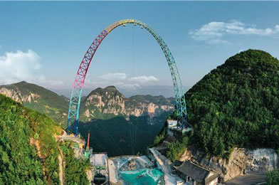 飛拉達(dá)是意大利文,是巖壁探險(xiǎn)或鐵道式攀登的音譯,指在山體巖壁上建設(shè)由鋼扶手、腳踏、生命鋼纜等構(gòu)成的攀登徑道。龍缸景區(qū)飛拉達(dá)位于標(biāo)識(shí)性景點(diǎn)云端廊橋左側(cè),距石筍河垂直高度700余米,攀登徑道全長600余米,主要由彩虹橋、鋼索、長空棧道、十二生肖秋千橋、空中圖騰柱、攀爬梯道組成,其中彩虹橋全長62米,因橋面板上繪制有不同色彩和風(fēng)景而得名。鋼索橋長約41米,由一根走繩、兩根扶繩組成,走繩非常細(xì)小,刺激驚險(xiǎn)。整個(gè)項(xiàng)目的錨固方式為采用化學(xué)錨栓錨固技術(shù)將鋼錨植入巖石1米多深,每一條鋼索的承重達(dá)到2噸左右。