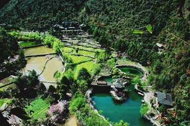 世外桃源面積約2公頃,形成歷史已有3億多年,是集天坑、溶洞、地下河于一體的退化天坑,四面環(huán)山,與世隔絕,是迄今唯一留存的秦人古村落。