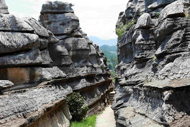 是因為巖溶塌陷,石頭斷裂而成的峽谷。石林東部并行排列三個石峽,分別稱為“蓮花峽、鳥鳴峽、聽泉峽”。三峽中最引人入勝的當(dāng)數(shù)聽泉峽,長達(dá)300米左右,而寬則在1—2米之間,最深80米左右。站立其中,仰頭觀望,只見一線藍(lán)天,就像一綹藍(lán)帶飄過頭頂。兩邊懸崖若削,高聳壁立,氣勢恢宏。兩面絕壁,均由大小形狀相似、重達(dá)數(shù)十噸的巨石塊組成。石塊間縫隙規(guī)矩,有若人工而成的古城墻一般。無論什么時候,都有水滴從巖壁上不停歇地滴落。這時候,不管外面溫度多高,這里都涼意襲人。