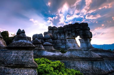 萬盛石林景區(qū),不僅怪石林立,且地下溶洞景觀遍布。主要為水平溶洞和垂直溶洞兩種。水平溶洞有天門洞、過街樓溶洞、涼風(fēng)洞、仙女洞、關(guān)馬洞、偷牛洞、九龍洞、觀音洞等。其中,數(shù)天門洞景觀獨特,造型別致,洞內(nèi)石筍、石柱、石花、石幔,吊、立、鉗,各盡其志,如玉器晶瑩,如宮殿輝煌?芍^“天造地設(shè),鬼斧神工”。
