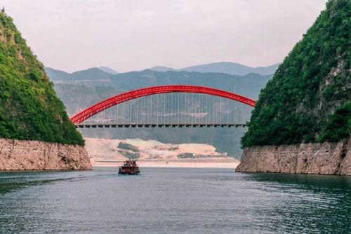 龍門大橋位于小三峽龍門峽峽口,在三峽水庫最終蓄水后,老龍門大橋主拱圈有三分之二以上部位被淹沒,橋下凈空不能滿足通航要求,因此拆舊橋建新橋。新龍門大橋與巫山長(zhǎng)江公路大橋形成姊妹橋,遙相呼應(yīng)。巫山新龍門大橋位于巫山縣城旁,舊龍門大橋下游90米處的龍門峽峽口。大橋主跨采用240米鋼管混凝土中承式拱橋一跨跨過,路線全長(zhǎng)855.911米。其主要工程量為鋼材2900噸和混凝土1.39立方米。全橋共兩拱肋,每肋13節(jié)段,11道橫撐,采用纜索無支架吊裝成拱。