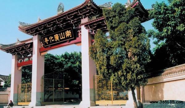 南山廣化寺:座落在城南鳳凰山,F(xiàn)行建筑群是清光緒初年依舊制重修的,從20世紀80年代開始,進行了大規(guī)模的擴建。山門照壁上有中國佛教會已故會長趙樸初題寫的“莊嚴國土,利樂有情”。廣化寺占地3.2萬多平方米,建筑物面積1.7萬平方米。踏入山門,沿著中軸線建筑拾級而上,全長385米。依次是照壁、牌坊、山門、放生池、彌勒殿(天王殿)、大雄寶殿、法堂(上為藏經(jīng)閣)、臥佛殿(下為祖堂);兩側(cè)翼建有寬敞的石柱廊廡,東側(cè)次第為東羅漢殿、鐘樓、五觀堂、伽藍殿、尊客堂、水云鄉(xiāng)、圓通門、溪聲閣;西側(cè)次第為西羅漢殿、鼓樓、學(xué)戒堂、祖師殿、凈行堂(念佛堂)、煙霞窟、方丈室、看山樓。寺后東西兩角的最高處,分別聳立著觀音閣和小南山。南山上有幾十株不知年代的蒼松翠柏。