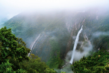 景區(qū)內(nèi)岱仙瀑布總落差約314米,單級落差184米,雄偉壯觀,被譽(yù)為“華東第一瀑”。晴天,陽光直射,水簾發(fā)光,彩虹若隱若現(xiàn),似巨幅珠簾下垂,像彩綢飛舞,蔚為壯觀。