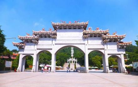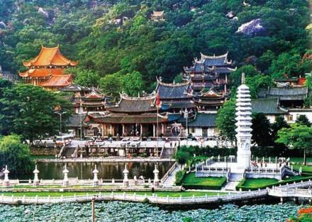 南普陀寺,位于廈門市思明區(qū),始建于唐末五代,初稱泗洲院。北宋僧文翠改建稱無盡巖。元廢。明初復(fù)建,更名普照寺。明末詩僧覺光和尚遷建于山前,殿堂院舍齊備,住僧常達百余眾,清初又廢于兵禍。清康熙二十二年(1684年),靖海候施瑯收復(fù)臺灣后駐鎮(zhèn)廈門,捐資修復(fù)寺院舊觀,又增建大悲閣奉觀音菩薩,并以之與浙江普陀山觀音道場相類比,更名為南普陀寺,此后數(shù)百年來,經(jīng)歷代主持景峰、省己、喜參諸和尚多次重修擴建,至民國初年,已構(gòu)成三殿七堂俱全的禪寺格局。