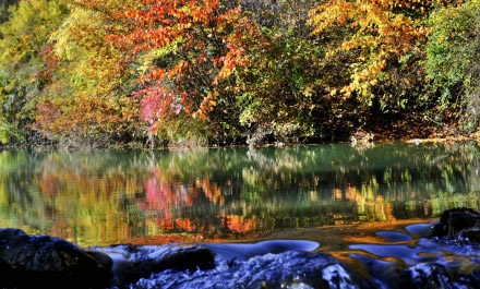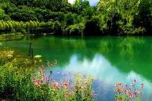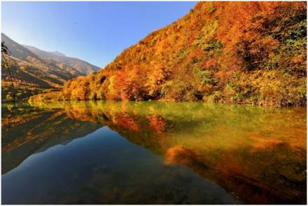 官鵝溝水美。13個大小不等、形態(tài)各異的湖泊,尤如一串綠色的珍珠鑲嵌在溝內(nèi),湖水清澈透底,隨湖底地貌高低呈不同顏色,那些倒映在湖中的古樹象一條條巨龍臥在湖底。藍(lán)天白云和青山古樹,映入湖中,使天地渾然一體,沒有界限。