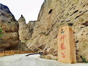 這里的石柱石筍大多高達(dá)八十至一百米之間,最高達(dá)二百多米,均由橘黃色砂礫巖構(gòu)成,鬼斧神工,猶如雕塑大師之夢(mèng)幻杰作。我們左行至飲馬溝入口,換乘當(dāng)?shù)剞r(nóng)民裝扮得極富民俗風(fēng)情的驢車前行。進(jìn)入峽谷,兩邊布滿了巨大的石筍、石人、石鐘、石崖、石窟,峰回路轉(zhuǎn),步移景變,人們將石景命名為:大象吸水、千帆競(jìng)發(fā)、伴侶駝、“黃河母親”等等,其形神兼?zhèn)洌蜩蛉缟?/p>