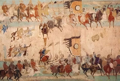 敦煌作為中西交通的樞紐,在壁畫(huà)上不僅留下了商旅來(lái)往的活動(dòng)情況,還留下了寶貴的交通工具的形象資料。他們有牛馬駝騾、驢象舟船、車(chē)轎輿輦等。常用的交通工具車(chē)輛類(lèi)型各異,牛車(chē)有“通牛車(chē)”、“偏牛車(chē)”、敞篷牛車(chē),馬車(chē)有駟車(chē)、駱車(chē),還有駱駝車(chē)、童車(chē)、獨(dú)輪車(chē)等,特別是保存了中國(guó)為世界交通做出獨(dú)有貢獻(xiàn)的獨(dú)輪車(chē)、馬套挽具(胸帶挽具和肩套挽具)、馬蹬、馬蹄釘掌等珍貴的圖像數(shù)據(jù)。西魏第285窟、北周第296窟五百盲賊皈依故事畫(huà),表現(xiàn)了騎著戰(zhàn)馬的騎兵,與身穿褲褶的步兵(強(qiáng)盜)作戰(zhàn)的場(chǎng)面,畫(huà)面上畫(huà)出了馬鎧,它是保護(hù)戰(zhàn)馬的防護(hù)裝備,古稱(chēng)具裝,或具裝鎧。第285窟馬鎧的形制齊全,從保護(hù)馬頭的“面簾”、到保護(hù)馬鞍后尻部的“寄生”一應(yīng)俱全。反映了漢代已有的具裝,到北朝時(shí)期已發(fā)展為玩唄成熟的保護(hù)裝備。馬鎧的產(chǎn)生和發(fā)展是中國(guó)為世界軍事裝備所作的獨(dú)有貢獻(xiàn)。