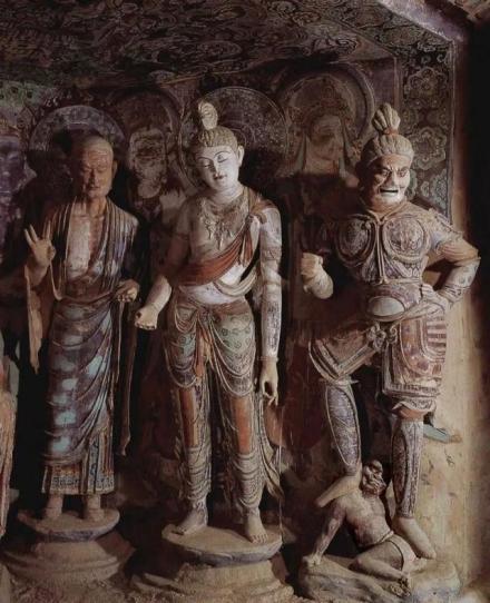 (1)早期——發(fā)展期,包括十六國(guó)、北魏、西魏、北周四個(gè)時(shí)代,歷時(shí)一百八十年。早期洞窟形制有三:1.禪窟,塑像在正龕。2.方形或長(zhǎng)方形殿堂窟,塑像置于正龕或南北壁列龕內(nèi)。3.中心柱窟,塑像置于長(zhǎng)方形柱四面之龕內(nèi)。從佛像類(lèi)別上分,有彌勒像、釋迦像和釋迦多寶并坐像,以表現(xiàn)的事態(tài)分,有說(shuō)法像、禪定像、思惟像。中心柱四面多為苦修、禪定、降魔、成道等像,主尊兩側(cè)多有侍從菩薩,形成一佛二菩薩的格式。早期彩塑多以彌勒為主尊,這與當(dāng)時(shí)傳自西域的彌勒信仰有密切關(guān)系。