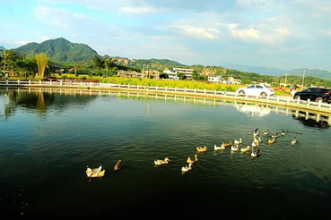 蕉嶺縣澳洲山莊位于長潭旅游區(qū)長潭水庫之濱的龍飛畬紅岌子,南盼寬闊的長潭水庫,北依雄偉的牙獅嶂,西靠八景之一的“仙橋飛渡”和丘逢甲故居,青山碧水,風(fēng)景如畫。占地面積2.2萬平方米,建有澳洲風(fēng)情館、水族館、動物園、賓館、酒樓、游泳池、健身館、茶藝咖啡館、百人會議廳等。館前長潭湖上浪遏飛舟,水族館各種游魚如鯽魚、鱷魚等,動物園有鴕鳥、駱駝、馬、羊、猴等,讓游人賞心悅目。正在興建中的山頂花園、釣魚臺、水上樂園、豪華別墅、山莊綠花依稀可觀,F(xiàn)在已建成一條由澳洲山莊至丘逢甲故居的公路。是長潭新八景之一。