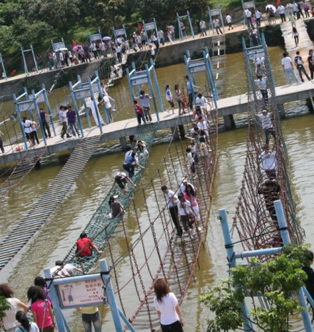 拓展訓(xùn)練基地占地面積10余畝,是深圳市青少年生存能力素質(zhì)教育基地,分為水上游樂區(qū)、高空拓展區(qū)與兒童游樂區(qū)。特別是水上游樂區(qū)涵蓋了霹靂滾桶、魔鬼車輪、木樁功夫橋和鐵鎖吊橋等有趣刺激拓展運(yùn)動項目。您既可以在青山綠水中盡情呼吸新鮮空氣,又可以在動感十足的拓展項目中挑戰(zhàn)自我,體驗這一風(fēng)靡全球的拓展運(yùn)動帶給你的無限快樂。項目網(wǎng)羅: 霹靂滾桶、魔鬼車輪、秋千橋 、連環(huán)獨木橋 、木樁功夫橋、 空中獨木橋、園木云梯橋、鐵鎖晃橋、長板坡 、 云梯橋 、鐵鎖鋼絲橋 、天羅地網(wǎng)、云梯功夫橋 、鐵鎖吊橋、 木樁功夫橋、水上漂 、鐵鎖橋、 一線鐵鎖橋 一線鐵鎖橋 、九曲獨木橋 、踏水無痕 、向風(fēng)起舞 、鐵甲四強(qiáng)等。
