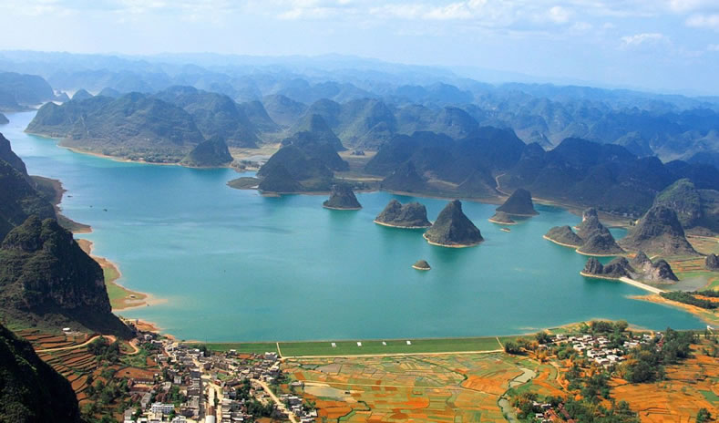 渠洋湖,是一個(gè)大型的喀斯特高原湖泊水庫。庫區(qū)總?cè)萘?228平方米,水質(zhì)優(yōu)良,有大小島嶼十多個(gè),沿岸有海拔一千多米的岜行山,以及掩映在綠樹翠竹當(dāng)中的幾百個(gè)壯族干欄式村寨。