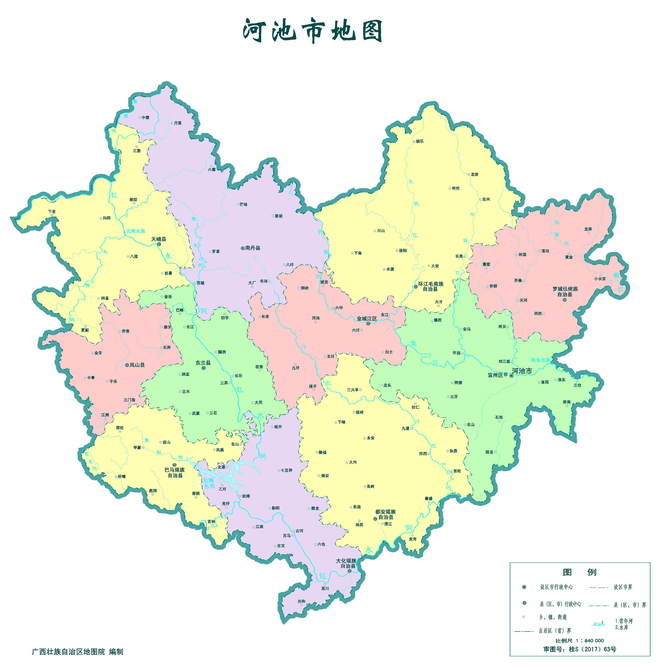 河池市轄2個(gè)市轄區(qū)、9個(gè)縣: