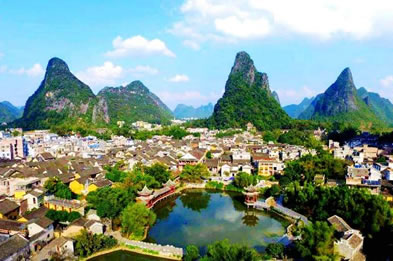 黃姚古鎮(zhèn)有“詩境家園”的“小桂林”之稱。境內(nèi)奇峰林立,古木參天,溶洞幽深,清溪環(huán)繞。古鎮(zhèn)有“六多”:山水巖洞多、亭臺(tái)樓閣多、寺觀廟祠多、祠堂多、古樹多、楹聯(lián)匾額多。古鎮(zhèn)內(nèi)有山必有水,有水必有橋,有橋必有亭,有亭必有聯(lián),有聯(lián)必有匾,構(gòu)成了古鎮(zhèn)獨(dú)特的風(fēng)景。古鎮(zhèn)8條主街道全部用黑色石板鑲嵌而成,雖歷經(jīng)滄桑,仍無絲毫松動(dòng),街道平滑如鏡。鎮(zhèn)內(nèi)600多座古建筑為九宮八卦陣式布局,屬嶺南風(fēng)格建筑。