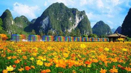 千畝錦繡花海舊州古城東山腳下,綿延千畝的種植區(qū)內(nèi)花卉、稻田、季節(jié)性花樹、觀賞性苗木錯落有致,因其形似一副色彩斑斕的巨幅壯錦而得名。分布有錦繡花海區(qū)、三生桃林、山楂樹之戀、丘比特之箭、七彩風(fēng)車陣、蟾宮桂花林、紅妝楓林、不染蓮池“那”文化展示區(qū)(水稻種植區(qū)和拾趣采摘園)等花卉景觀。