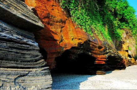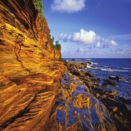 滴水丹屏原名滴水巖,位于潿洲島西部的滴水村,由巖石形成的懸崖峭壁是典型的海蝕地貌,裸露著的巖層,紅、黃、紫、綠、青五色相間,紋理十分清晰,崖頂之上藤樹(shù)纏繞,紅花綠葉倒掛崖頭,展現(xiàn)出旖旎多姿的色彩,故稱“丹屏”。巨崖巖層上長(zhǎng)年涌動(dòng)著水珠,不斷地向崖下滴落,所以取名“滴水”。滴水丹屏的形成堪稱是中國(guó)火山景觀的奇跡。