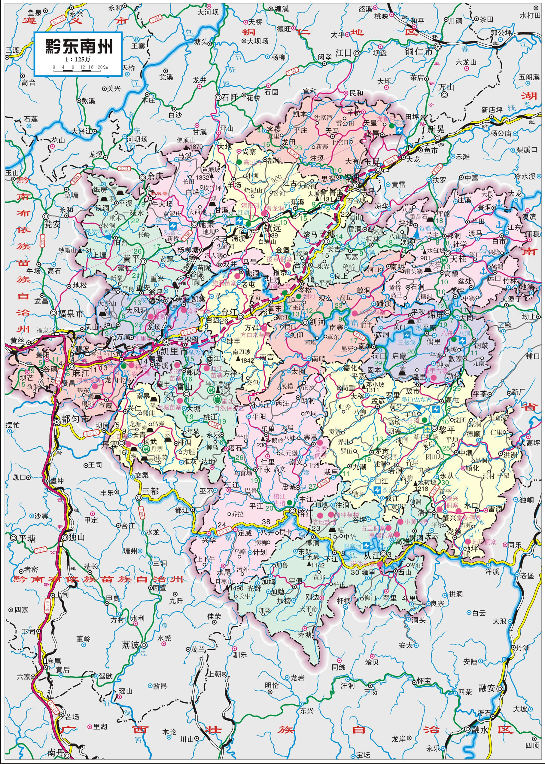 1958年12月調(diào)整行政區(qū)劃,丹寨、麻江、爐山、雷山4縣合并建凱里縣,臺(tái)江縣并入劍河縣,從江縣并入榕江縣,施秉縣并入黃平縣,岑鞏縣、三穗縣并入鎮(zhèn)遠(yuǎn)縣,天柱縣并入錦屏縣,全州設(shè)7個(gè)縣。