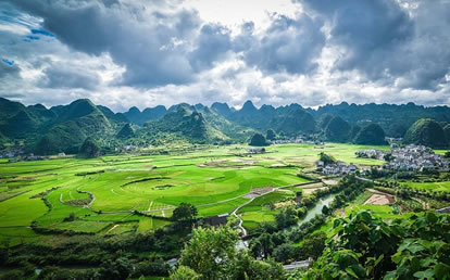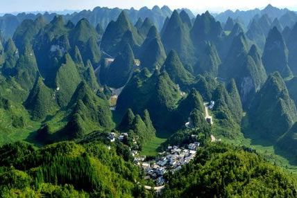 從地質學的角度看,北部為峰林盆地,中南部為峰林洼地和峰叢山地,峰林、峰叢大多為呈錐形,部分為鐘狀、平頂狀和馬鞍狀,堪稱一座“中國錐狀喀斯特博物館”。南北兩段峰林也各具特色,北部峰林如同一道屏風,護佑著耳寨、魚隴、雙生、樂立一帶的村寨田園。這里奇峰如林,田壩似錦,河水如帶,村寨如云,充滿詩情畫意,恰似一幅樸素、清麗的布依族織錦。