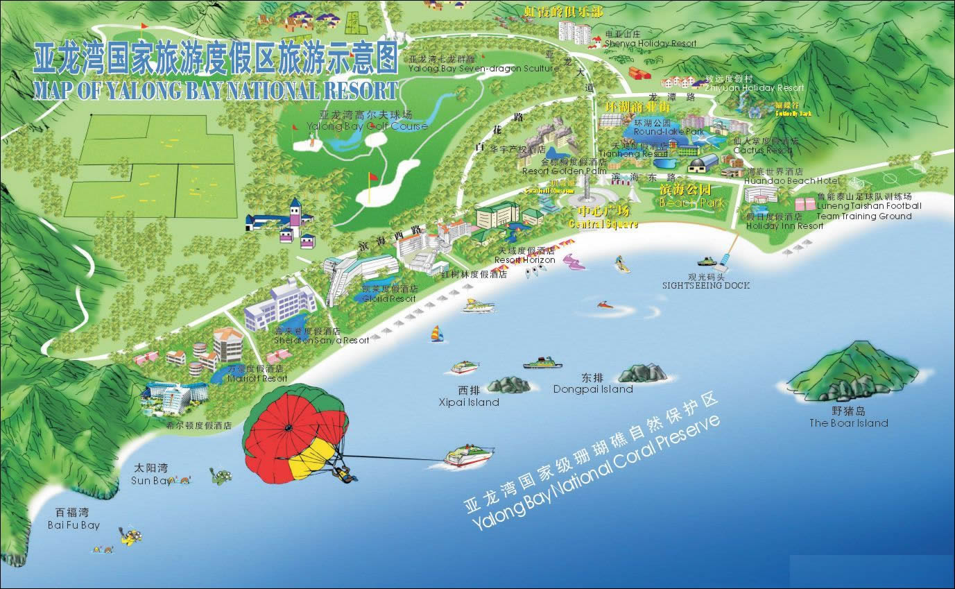 亞龍灣為一個(gè)月牙灣,擁有7千米長(zhǎng)的銀白色海灘,沙質(zhì)相當(dāng)細(xì)膩。而這里的南海沒(méi)有受到污染,海水潔凈透明,遠(yuǎn)望呈現(xiàn)幾種不同的藍(lán)色,而水面下珊瑚種類豐富,可清楚觀賞珊瑚,適合多種水面下活動(dòng)包括潛水等,令海底成為了當(dāng)?shù)氐穆糜蔚暮诵摹0渡狭帜居粲羰[蔥。冬季這里的氣溫27攝氏度,水溫20攝氏度,是一處理想的冬季避寒和休閑度假勝地。號(hào)稱“東方夏威夷”。沿海岸一帶布滿多座高級(jí)酒店,包括國(guó)際五星級(jí)的假日酒店。