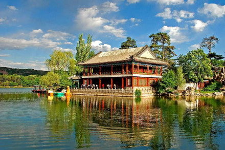 湖泊區(qū):苑景區(qū)的精華基本上在湖泊區(qū),康熙曾夸耀說(shuō),“天然風(fēng)景勝西湖”。由于洲島錯(cuò)落,湖面被長(zhǎng)堤和洲島分割成5個(gè)湖,各湖之間又有橋相通,兩岸綠樹(shù)成蔭,山莊主要的風(fēng)景建筑又都散落在湖區(qū)的周圍,因此顯得曲折有致,秀麗多姿。湖泊區(qū)位于山莊東南,面積49.6萬(wàn)平方米。有大小湖泊八處,即西湖、澄湖、如意泅、上湖、下湖、銀湖、鏡湖及半月湖,統(tǒng)稱為塞湖。 湖區(qū)的風(fēng)景建筑大多是仿照江南的名勝建造的,如“煙雨樓”,是模仿浙江嘉興南湖煙雨樓的形狀修的。金山島的布局仿自江蘇鎮(zhèn)江金山。湖中的兩個(gè)島分別有兩組建筑,一組叫“如意洲”,一組叫“月色江聲”!叭缫庵蕖鄙嫌屑偕健鐾、殿堂、廟宇、水池等建筑,布局巧妙,是風(fēng)景區(qū)的中心!霸律暋笔怯梢蛔碌乃暮显汉蛶鬃ぁ⑻媒M成。每當(dāng)月上東山的夜晚,蛟潔的月光,映照著平靜的湖水,山莊內(nèi)萬(wàn)籟俱寂,只有湖水在輕拍堤岸,發(fā)出悅耳的聲音,“月色江聲”的題名便是由此而來(lái)。湖泊區(qū)集南方園林之秀和北方園林之雄,將江南園林的景觀移植到塞外。區(qū)內(nèi)湖泊總稱“塞湖”,總面積57公頃。