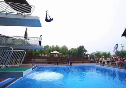 新增項(xiàng)目: 高空氣泡跳水。景區(qū)引進(jìn)德國(guó)的凈水裝置和氣泡裝置,通過(guò)氣泡裝置降低水密度,減少入水時(shí)游客承受的壓力,降低安全風(fēng)險(xiǎn),設(shè)置了距離水面1m、3m、5m三種高度的跳臺(tái)。