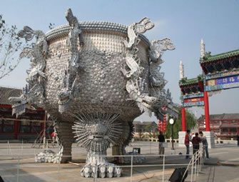 九龍鼎采用杯、羹、匙、盅、盤、碟、碗等青花玲瓏瓷具近4萬件,鼎高和直徑均為6米,最大處直徑10米,通過資深彩燈匠人利用棉線,親手捆扎手工編織而成。各類瓷器都按照設(shè)計(jì)圖紙標(biāo)準(zhǔn)施工,制作工藝精巧、制作過程嚴(yán)謹(jǐn)。主體為鋼結(jié)構(gòu),整體外光源,龍頭有LED追光變幻和噴霧效果。其創(chuàng)意深邃,規(guī);趾耄瑯(gòu)思巧妙、制作精致、氣勢(shì)磅礴,既露王者風(fēng)范又顯民俗特色。
