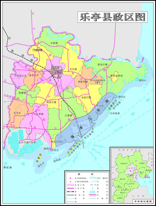 鎮(zhèn):樂亭鎮(zhèn)、湯家河鎮(zhèn)、胡家坨鎮(zhèn)、王灘鎮(zhèn)、閆各莊鎮(zhèn)、馬頭營鎮(zhèn)、新寨鎮(zhèn)、汀流河鎮(zhèn)、姜各莊鎮(zhèn)、毛莊鎮(zhèn)、中堡鎮(zhèn)