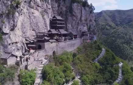 媧皇閣是媧皇官建筑群的主體建筑,它依著山崖峭壁修建,共分為四層。第一層是拜殿,拜殿之上又建了三層樓閣,總高23米。媧皇閣背靠懸崖,用八條鐵索將樓體系在懸崖峭壁之上。素有“吊廟”、“活動(dòng)樓”之稱。媧皇閣底層為石窟,始建于北齊天保年間(公元550~559年)是媧皇宮最早的建筑之一。