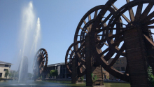 水車風(fēng)情街,水車群組6臺(tái),高28米,直徑20米,單體重量9.6噸。嵖岈水車外形酷似古式車輪,提水26米高,輪輻中心是合抱粗的輪軸,圓輪四周斜裝有50個(gè)左右的木斗,以及比木斗多一倍的橫板。