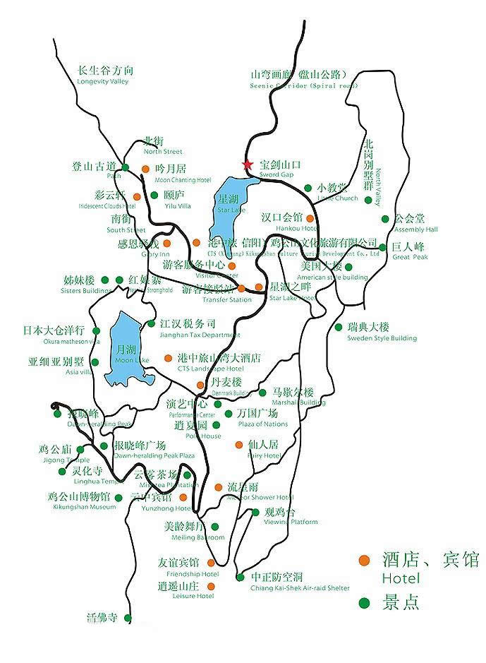 避暑山莊現(xiàn)存別墅十組二十幢7800平方米,計劃逐步整修,現(xiàn)保存較好的有肖家大樓、環(huán)翠樓、聳青閣、臥虎樓、翠云樓等。