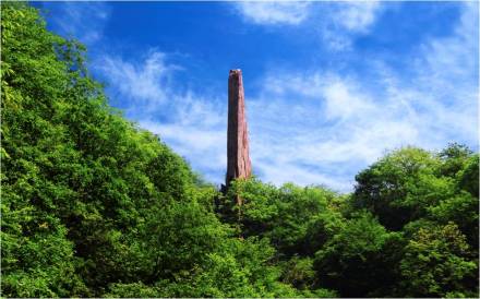 天碑高達50余米,是一個巨型崩塌巖塊。由于崩塌時的位移,原來近水平產(chǎn)出的巖層此時呈直立狀,巍然聳峙在峽谷一側,高大雄偉、氣勢恢弘,一景多變,步移景換,從不同角度仰望,或蒼鷹、或飛鳥、或飛魚、或刀背、或天碑,大自然賦予其無限美感。傳說,這本是二郎神斬殺小白龍的大刀,圣母媧皇在安置了小白龍神位之后,又把二郎神丟下的大刀豎立起來,刀背對著無頭冤神洞,于是二郎神斬殺小白龍的大刀,成了紀念小白龍的無字碑,人們稱其為“擎天刀碑石”。