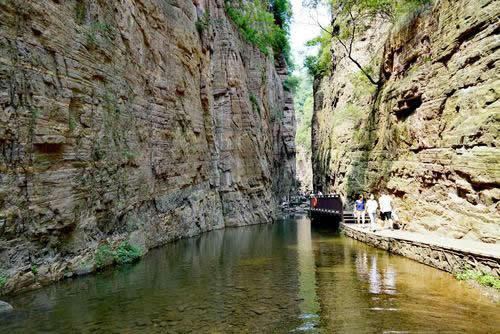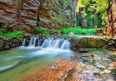 龍?zhí)洞髰{谷景區(qū)是王屋山——黛眉山世界地質公園的核心景區(qū),是一條以典型的紅巖嶂谷群地質地貌景觀為主的峽谷景區(qū)。谷內(nèi)關峽相望,潭瀑聯(lián)珠,壁立萬仞,峽秀谷幽,經(jīng)過十二億年的地質沉積和260萬年的水流切割旋蝕所形成的高峽甕谷、山崩地裂奇觀,堪稱世界一絕,人間少有,享有“中國嶂谷第一峽”、“古海洋天然博物館”、“峽谷絕品”和“黃河水畫廊”等美名。